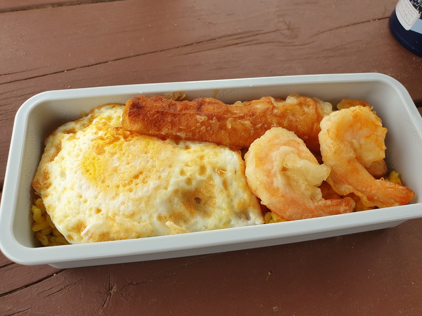 카레 필라프 / 계란 후라이 / 새우 튀김 / 대롱어묵튀김