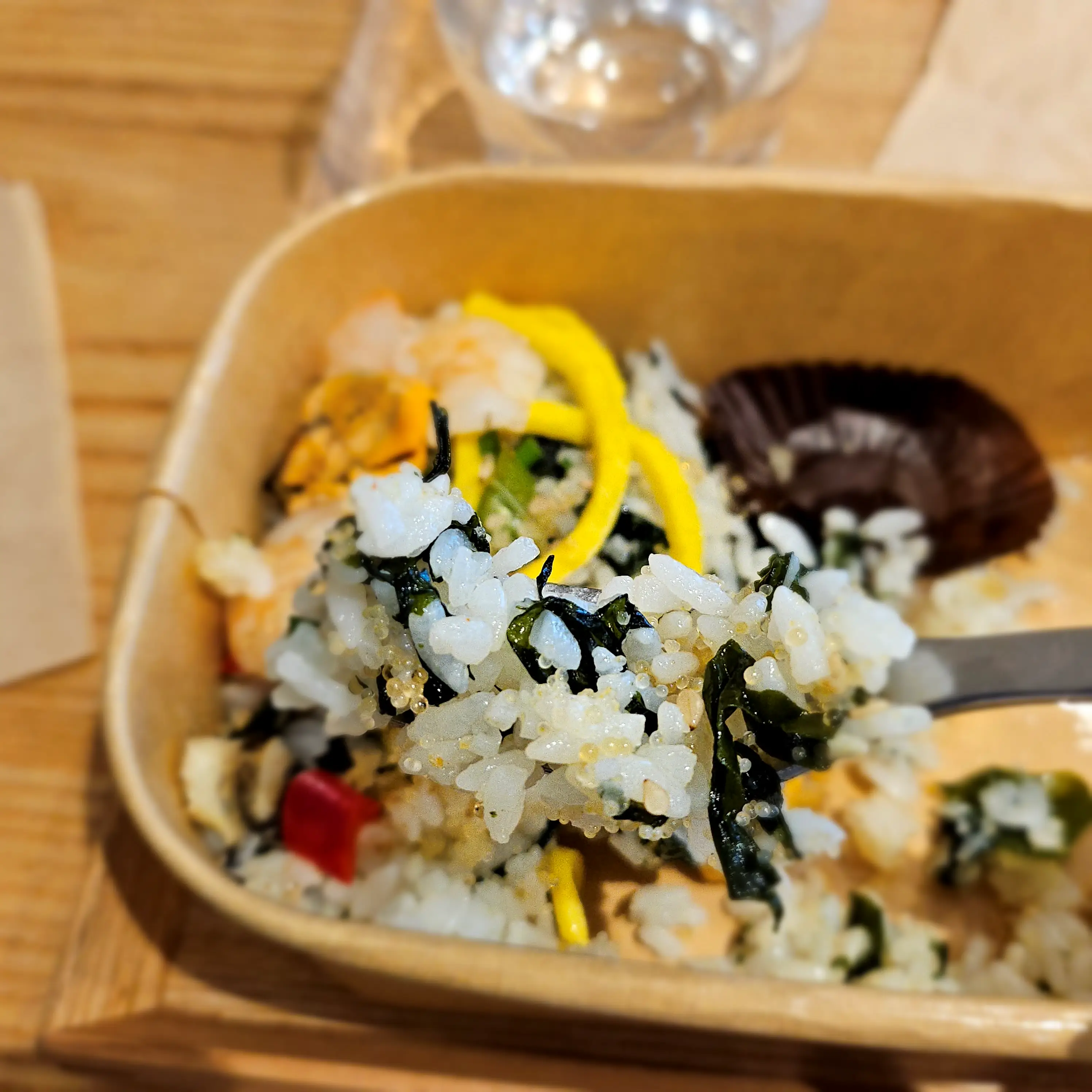 미역을 넣어 지은 밥에 홍합, 새우, 소라가 골고루 들어 있어요.