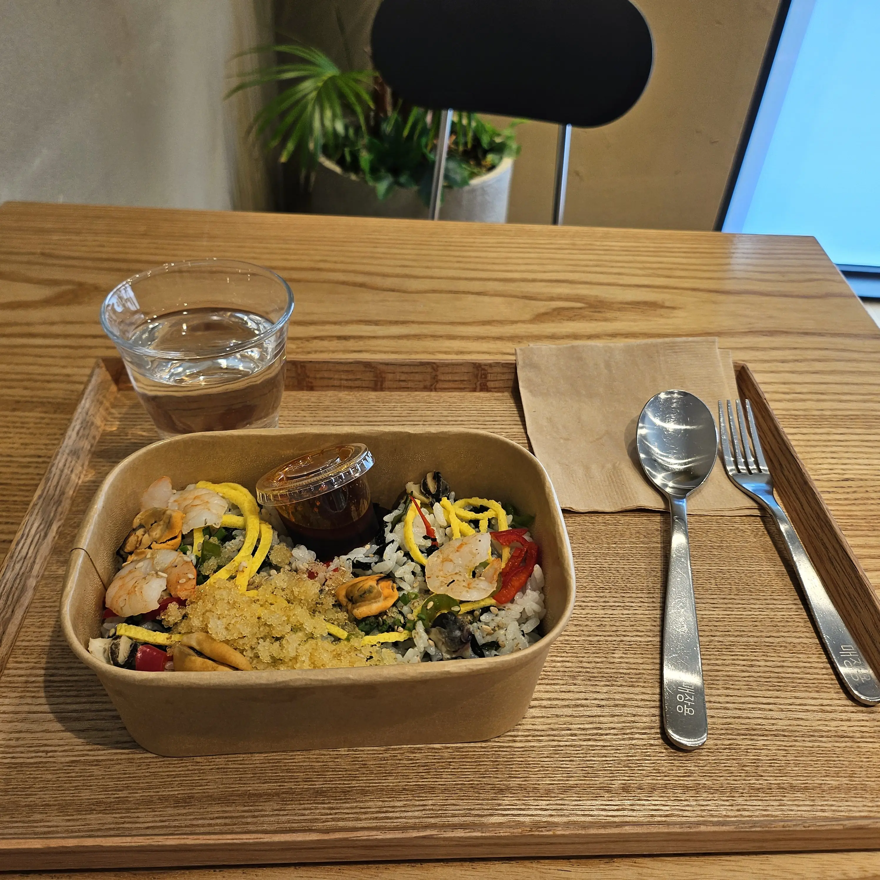 도시락을 사서 카페 카운터로 가면 도시락을 데워주고 수저, 포크, 물컵을 준비해 줍니다.
