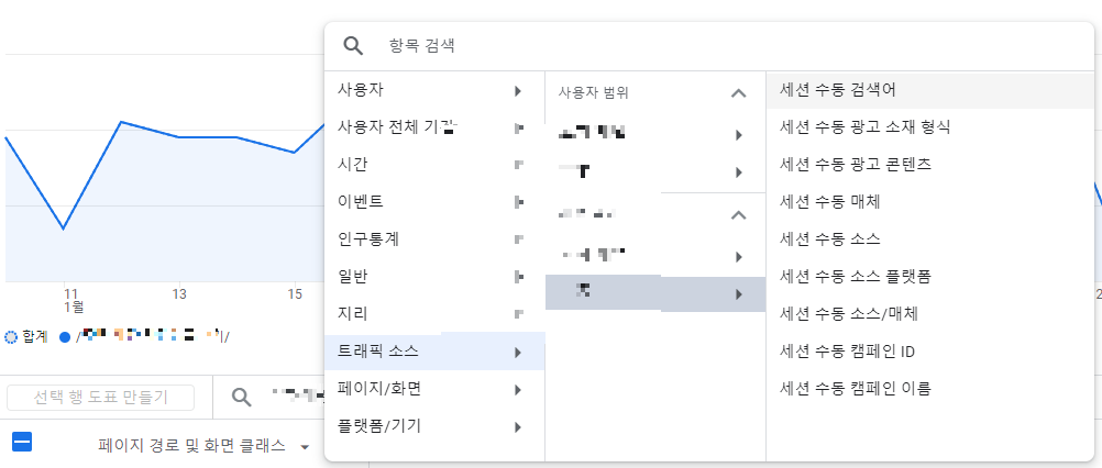 3. 페이지 경로 및 화면 클래스 옆 ➕버튼을 누르면 아래와 같은 메뉴가 나온다. 트래픽 소스 > 세션 범위 > 수동 > 세션 수동 검색어 를 선택한다.