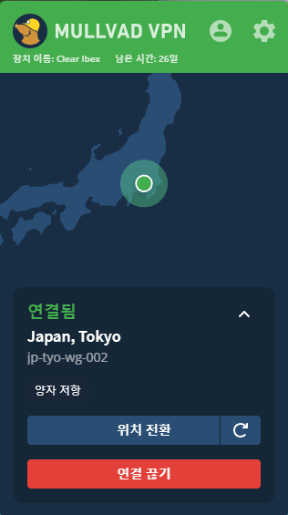 사용할 때는 Mullvad VPN 앱을 설치하고 일본으로 위치를 변경한다.
