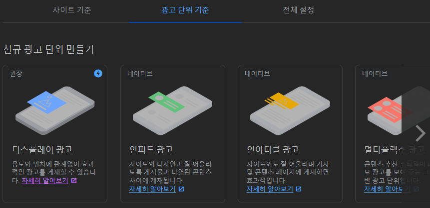 2. 신규 광고 단위 만들기에서 디스플레이 광고를 선택하고 만든다. 광고 크기는 반응형으로 설정한다.