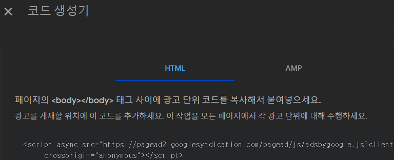 3. 광고 단위를 새로 생성하고 나면 광고 단위 코드가 나온다. 이 코드를 복사한다.