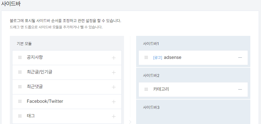 2. 꾸미기 > 사이드바에 가면 [광고] adsense 모듈이 새로 생겼을 것이다. 사이드바 1, 2, 3 중 원하는 위치에 드래그하면 끝.