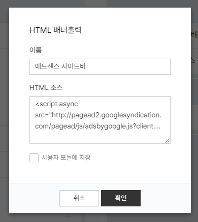 7. HTML 배너출력 모듈을 선택해서 편집한다. HTML 소스에 아까 복사한 광고 단위 코드를 넣는다.