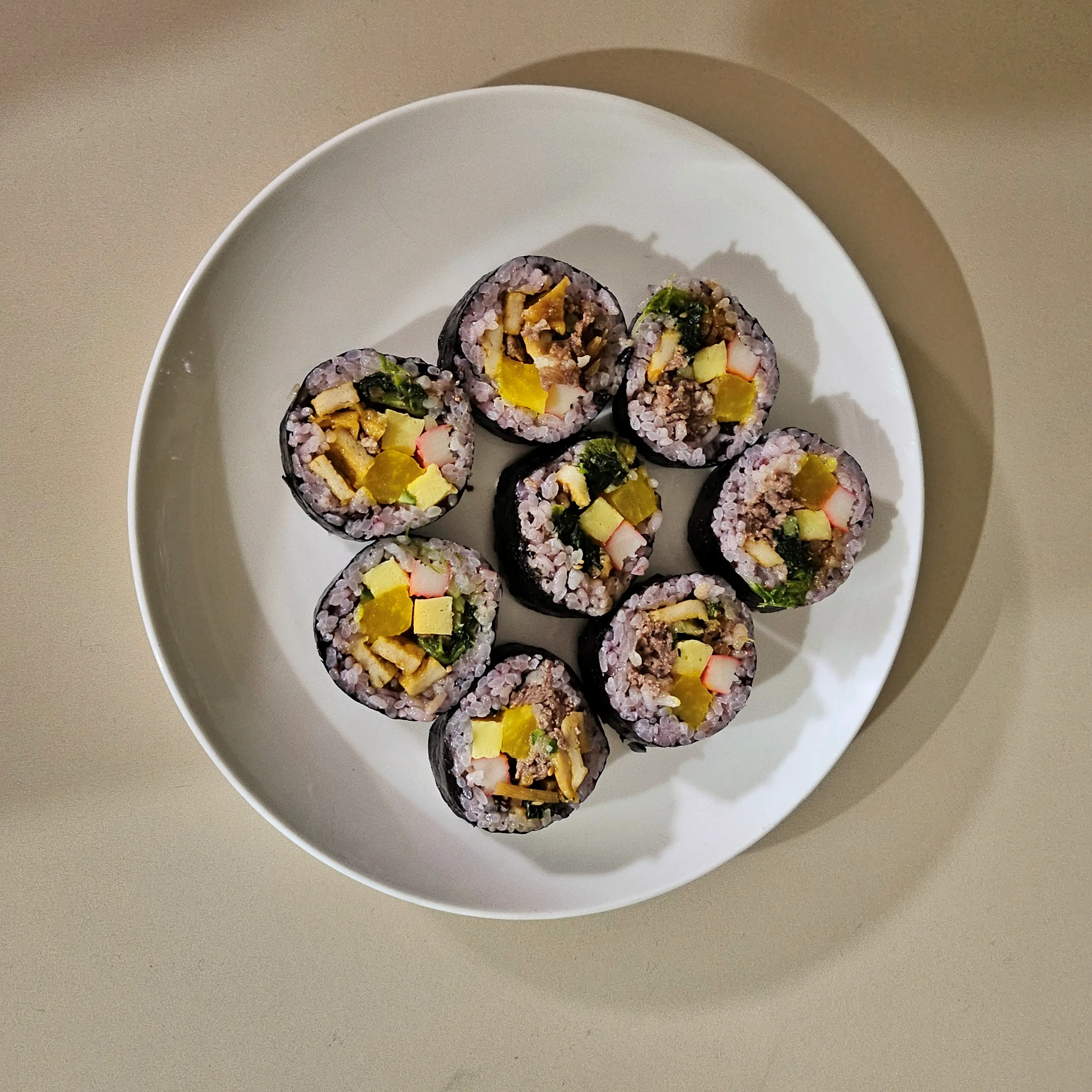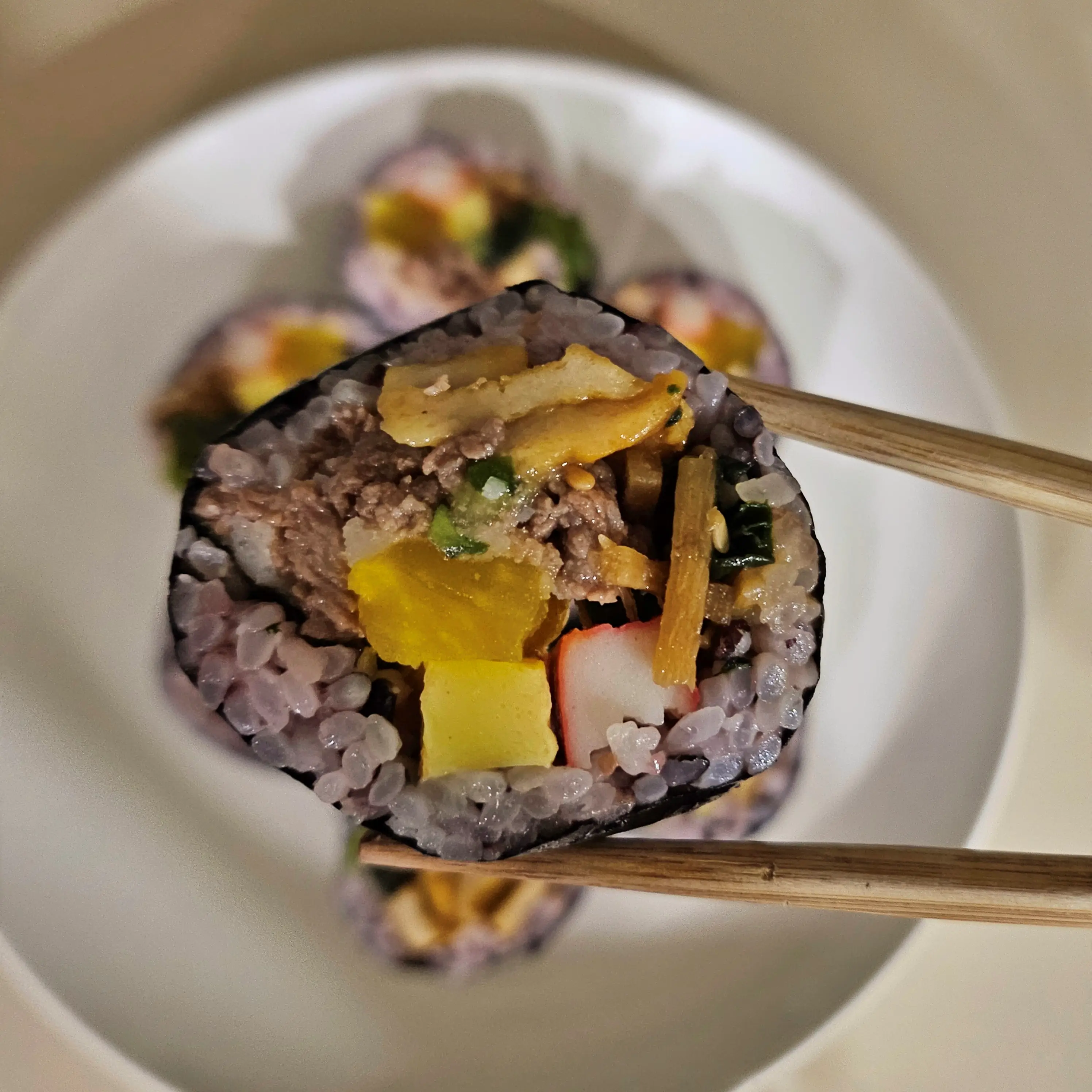 속재료로는 소고기, 오이, 우엉, 단무지, 계란, 어묵, 맛살이 들어 있습니다.
